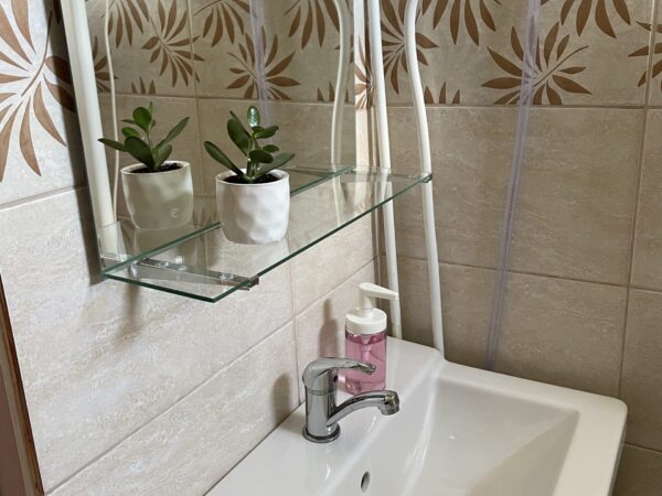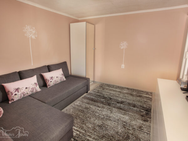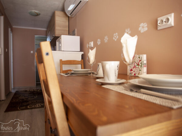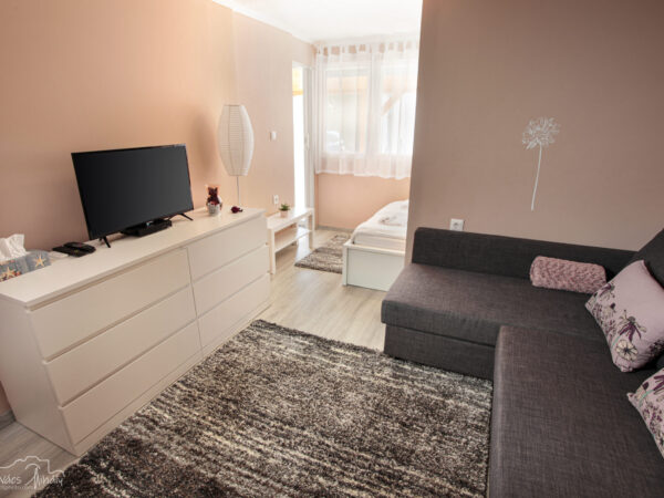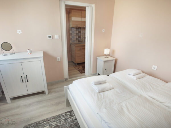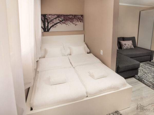 A nagyobb, baloldali apartmanban 4 személy szállásolható el. A lakrész rendelkezik egy különálló hálószobával (melyben egy 160×200-as franciaágy kapott helyet), továbbá egy sarokkanapés nappalival, melyhez egy pengefallal elválasztott hálófülke tartozik (140×200-as franciaággyal), valamint konyhával és fürdőszobával, illetve saját terasszal.