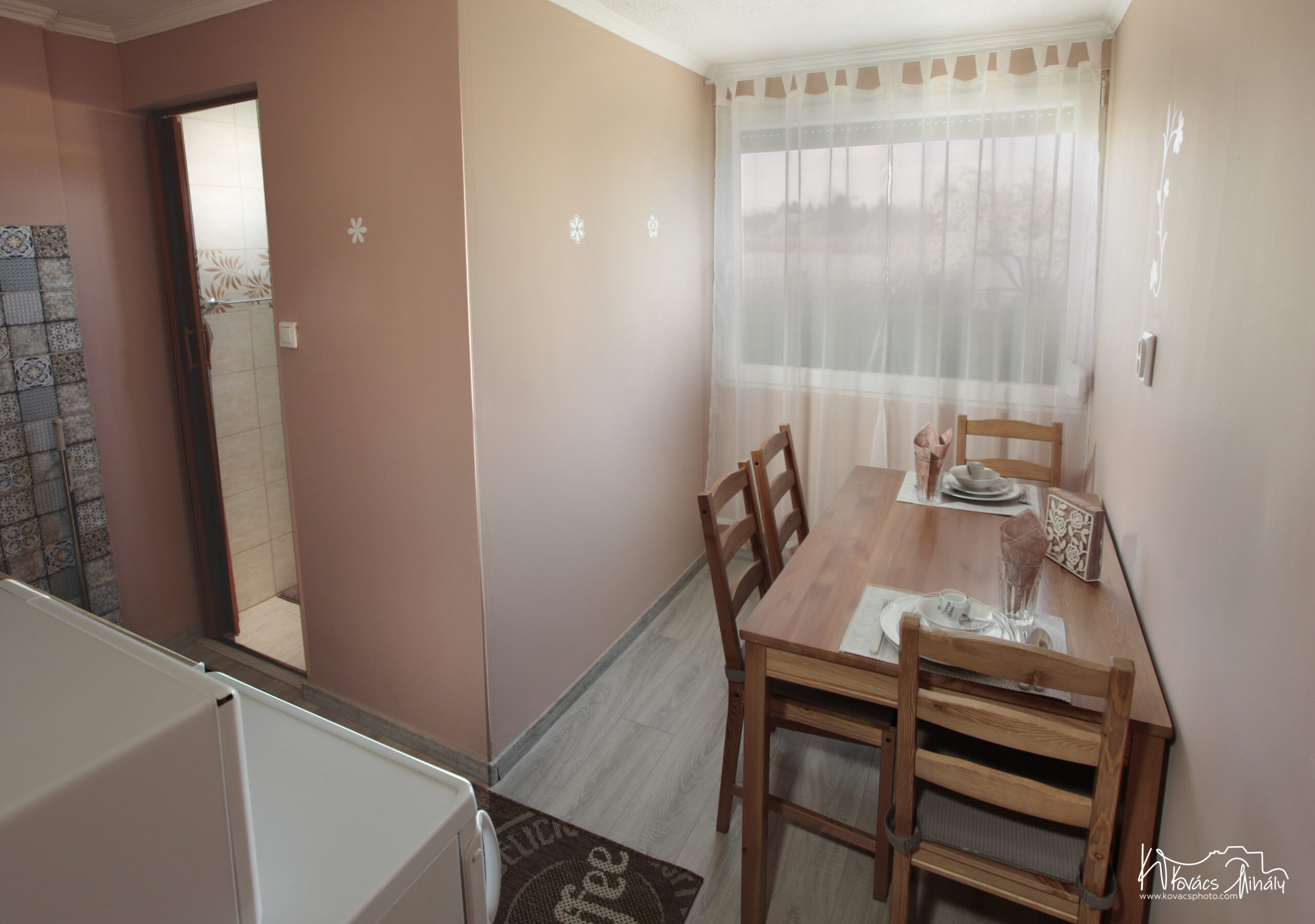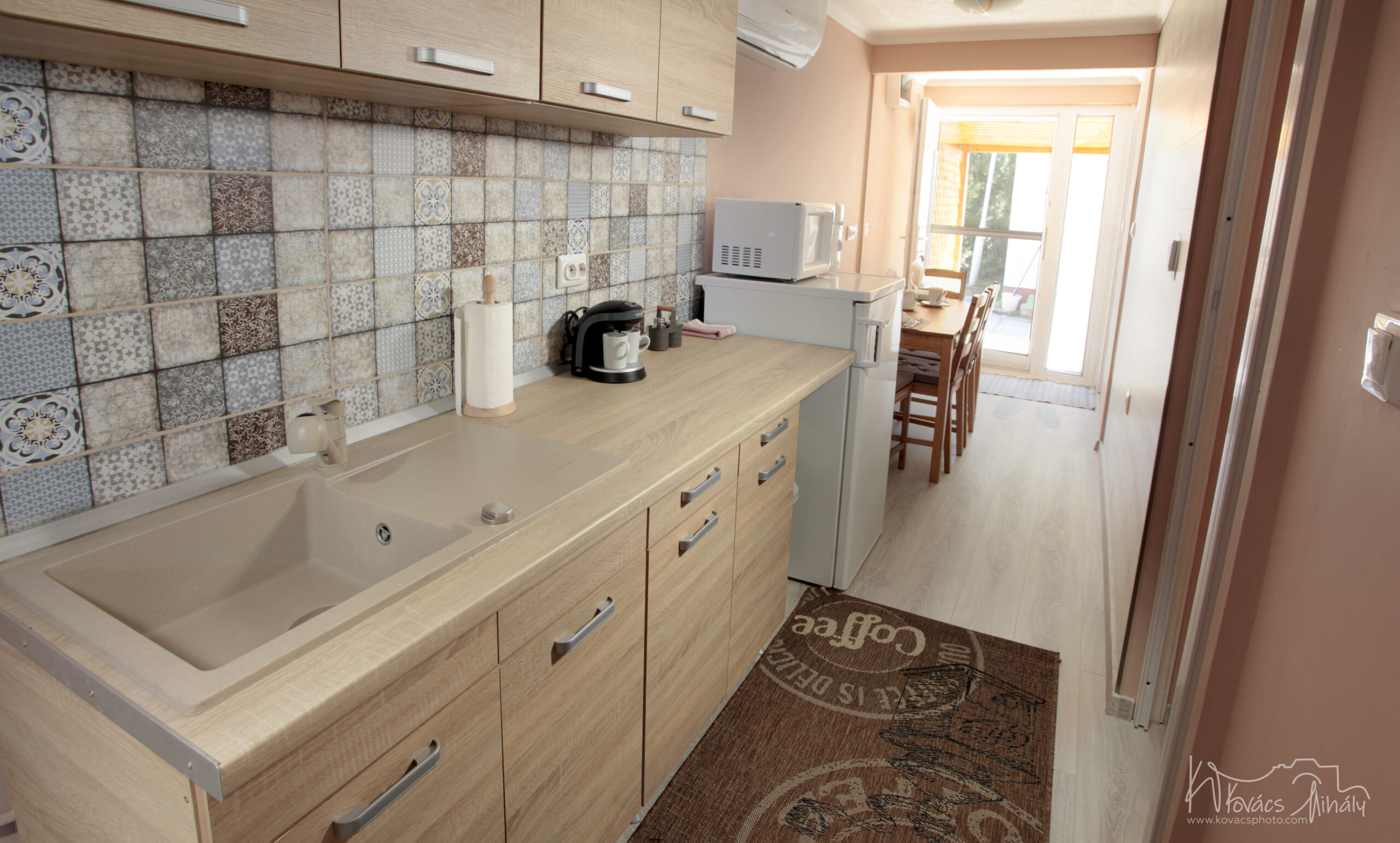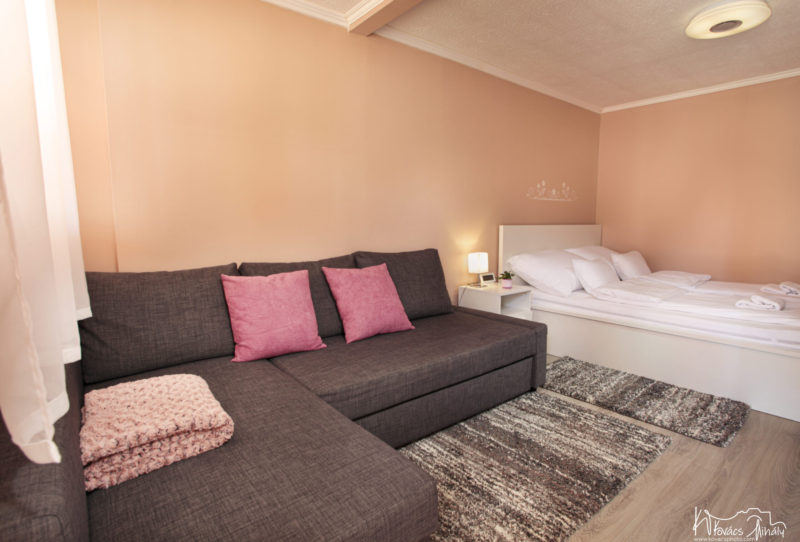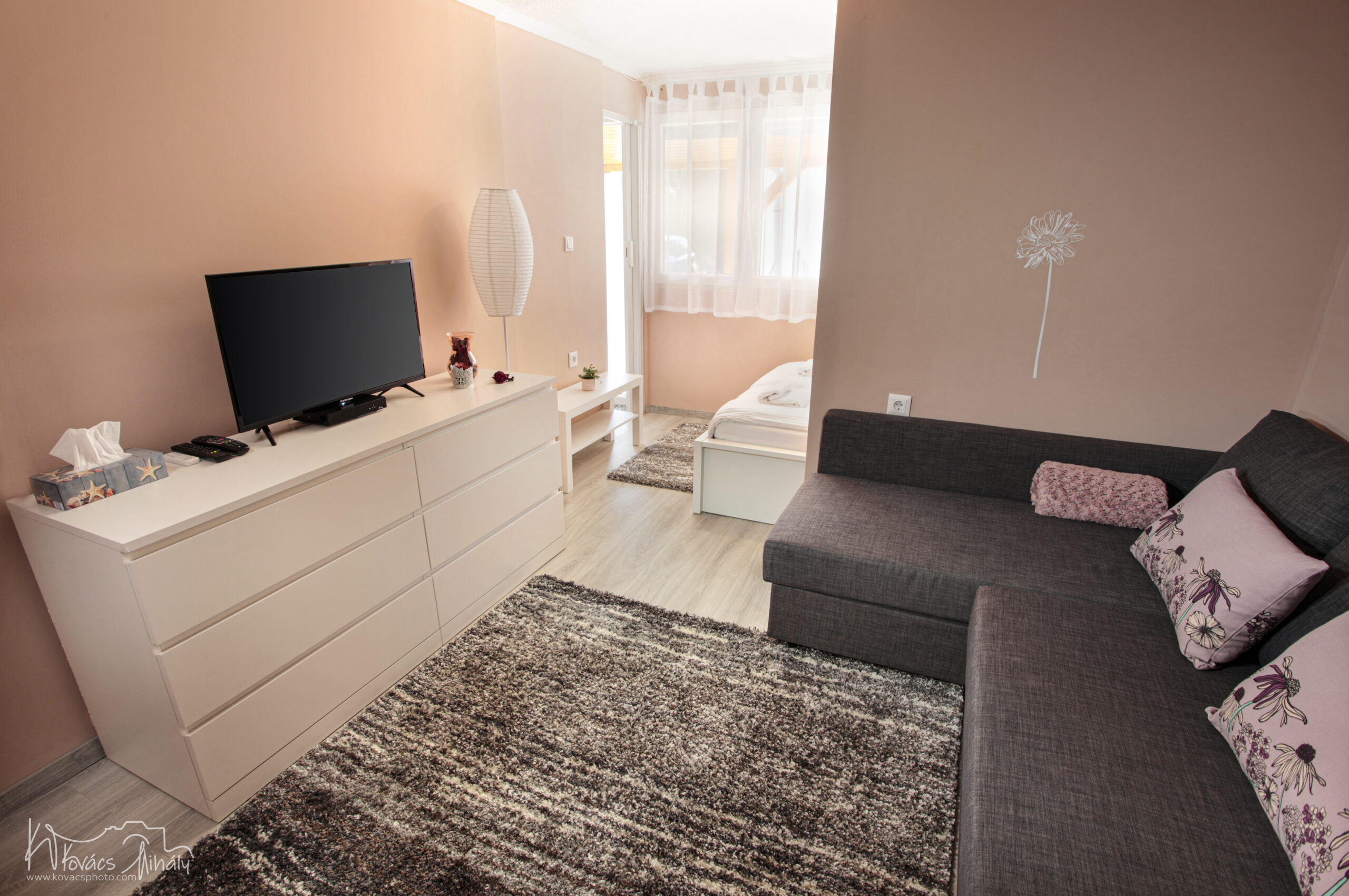 A lakrészt egyterű nappali és hálótér (160×200-as franciaággyal és 140×200-as ággyá nyitható sarokkanapéval), valamint külön nyíló konyha és fürdőszoba, illetve saját terasz alkotja.