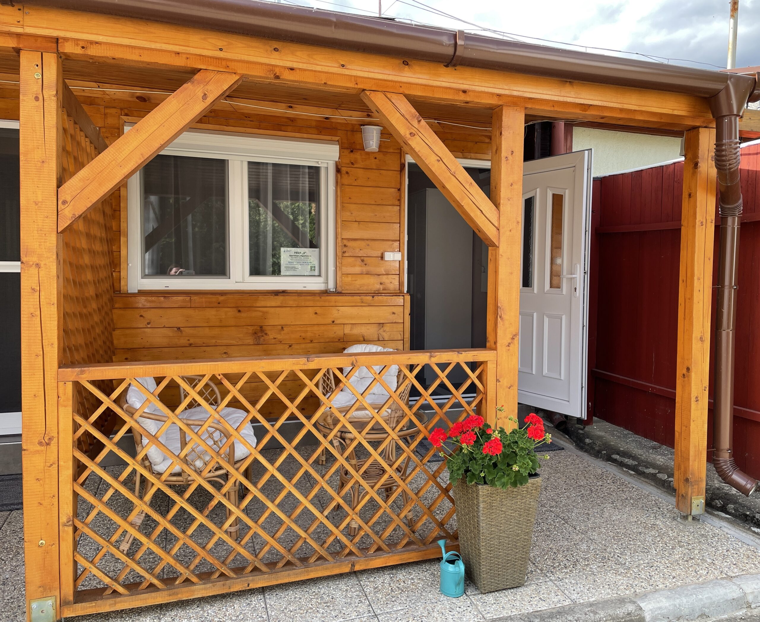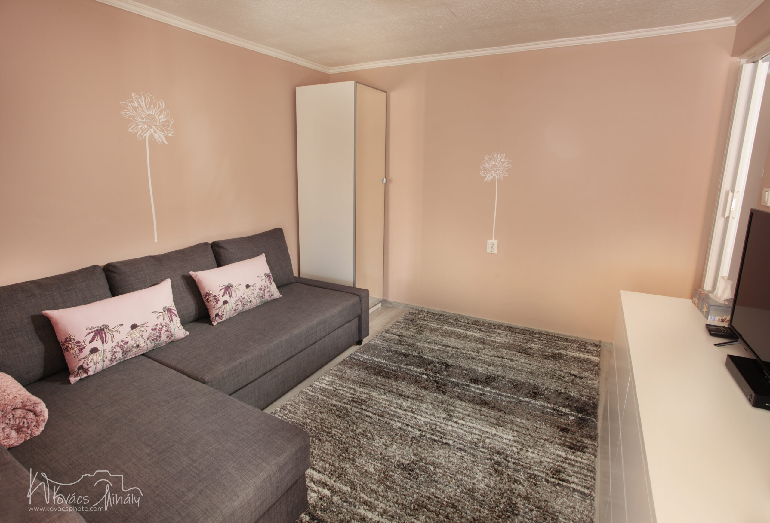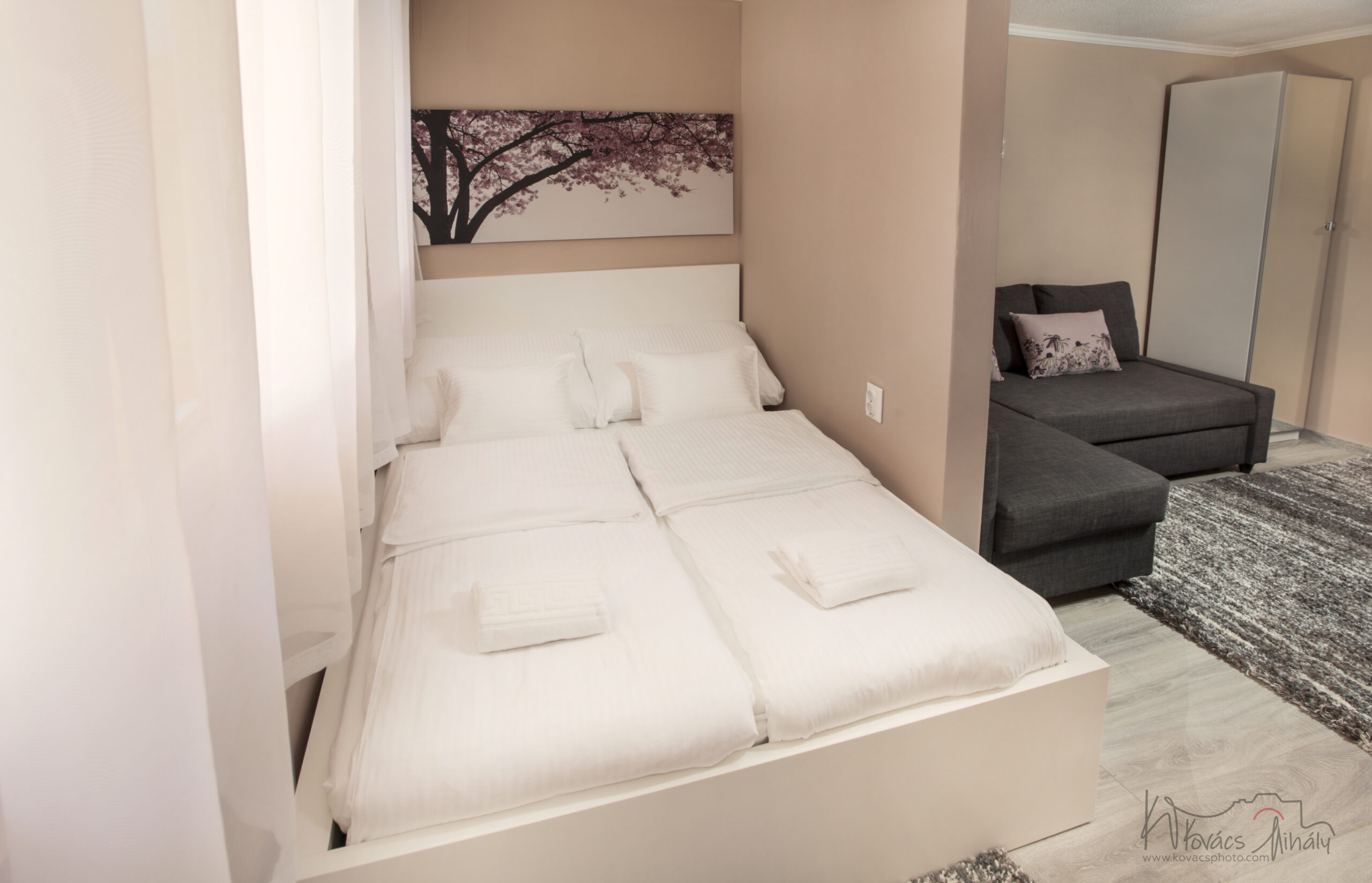 A lakrészt egyterű nappali és hálótér (160×200-as franciaággyal és 140×200-as ággyá nyitható sarokkanapéval), valamint külön nyíló konyha és fürdőszoba, illetve saját terasz alkotja.