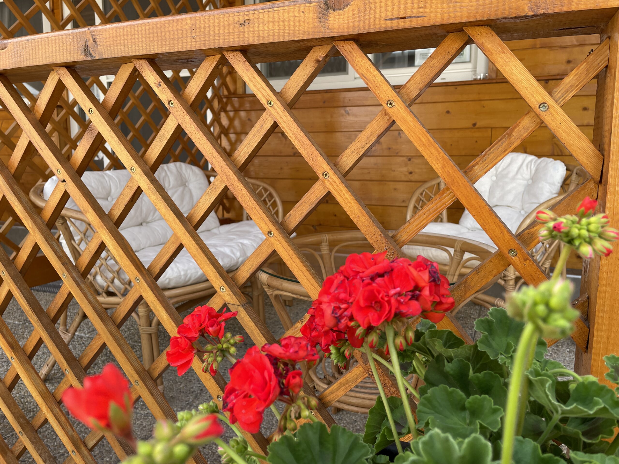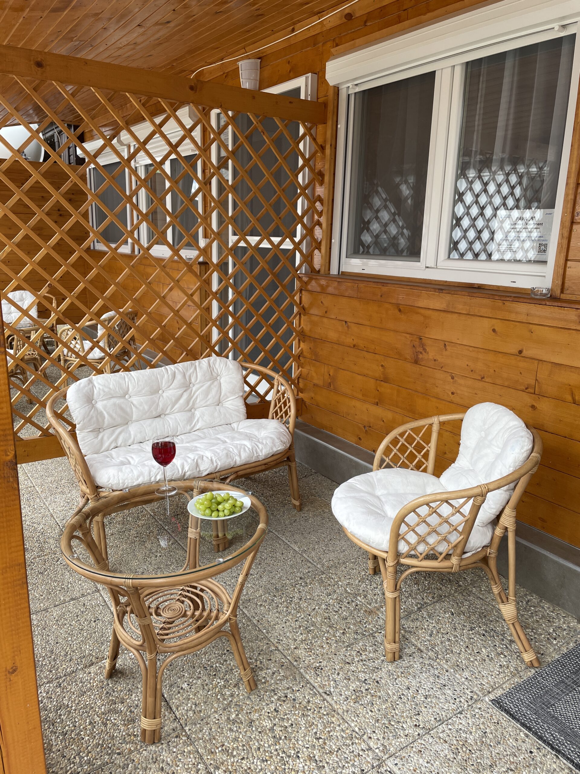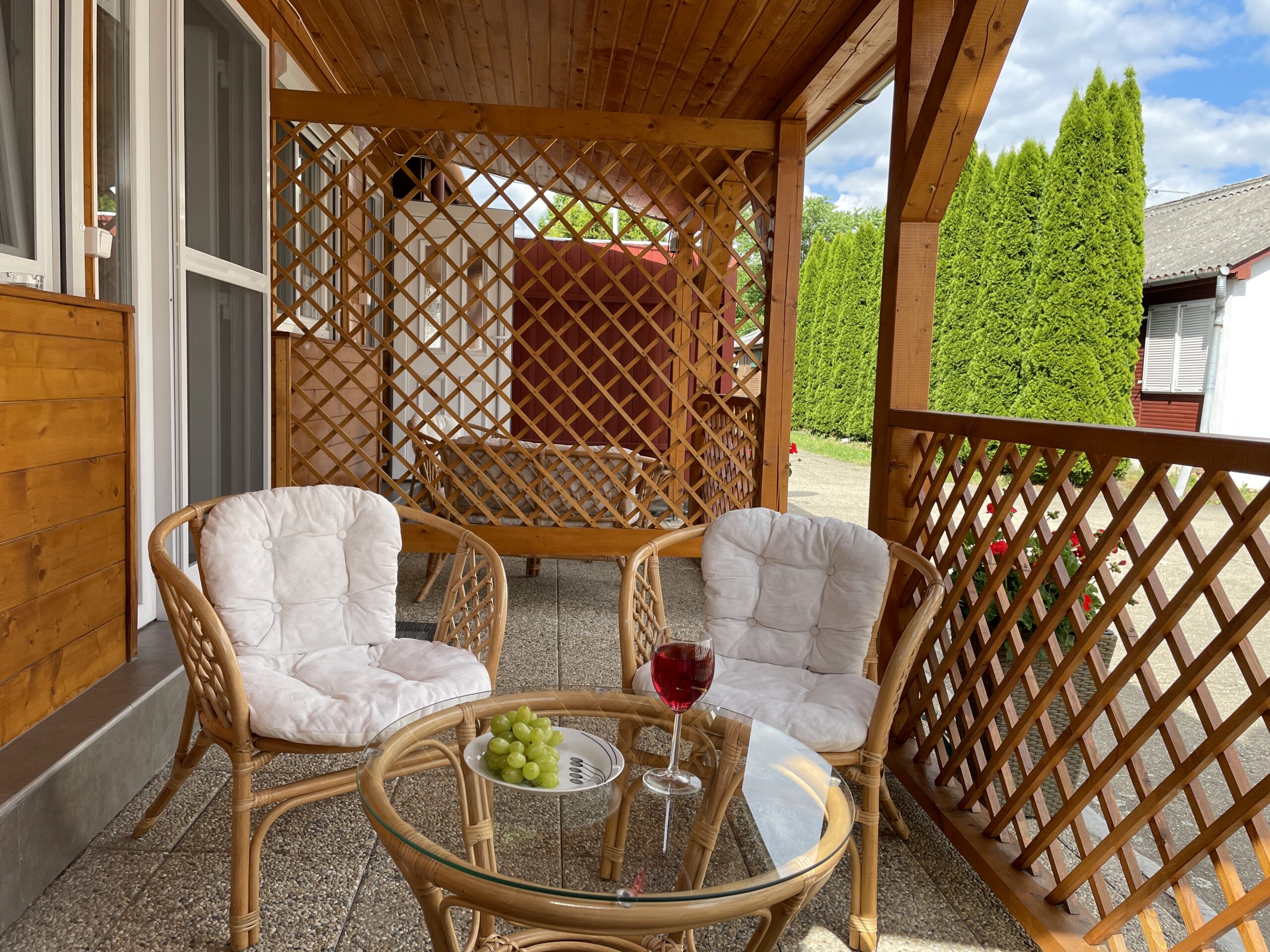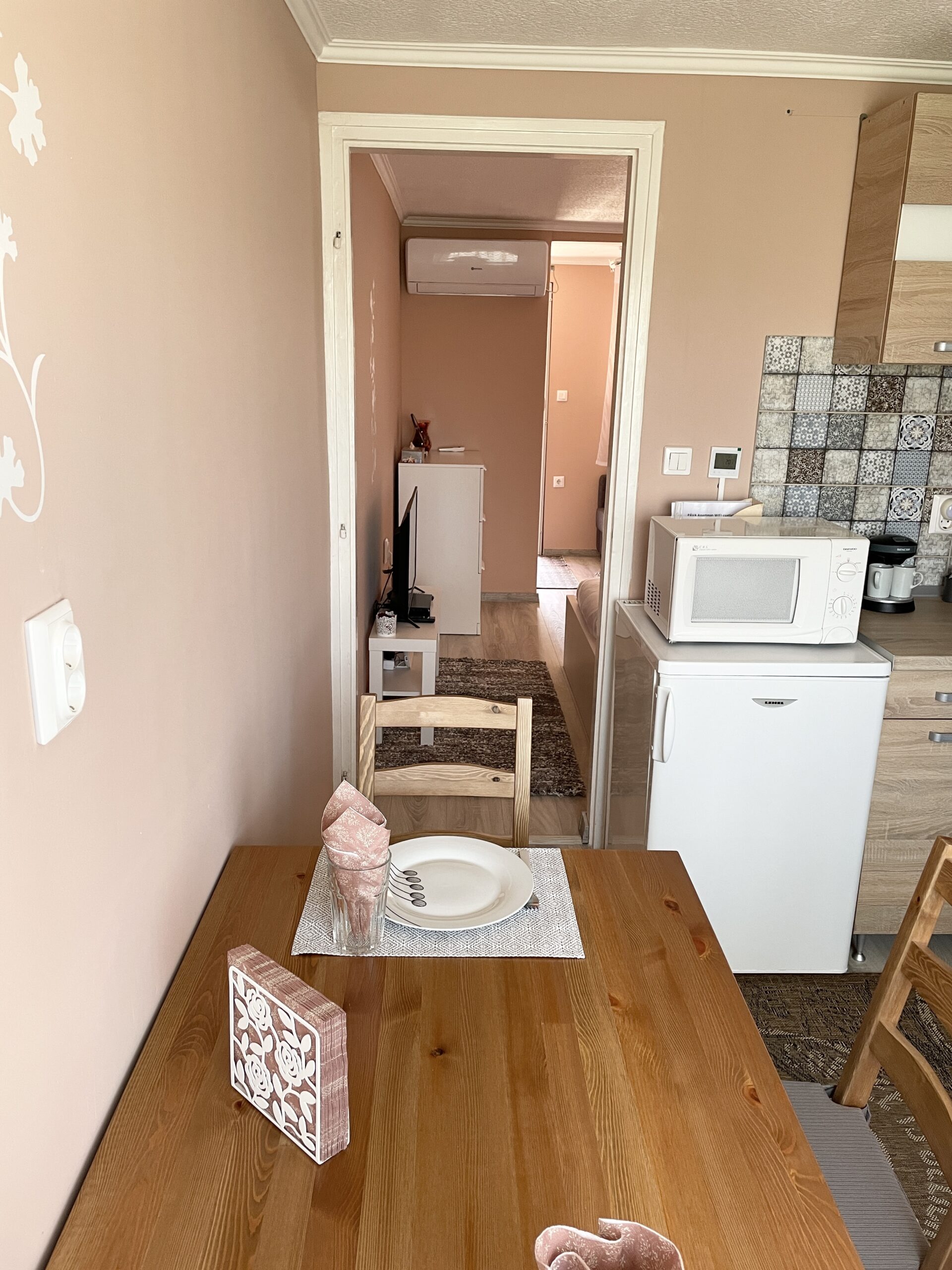 A lakrészt egyterű nappali és hálótér (160×200-as franciaággyal és 140×200-as ággyá nyitható sarokkanapéval), valamint külön nyíló konyha és fürdőszoba, illetve saját terasz alkotja.